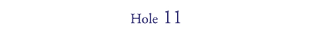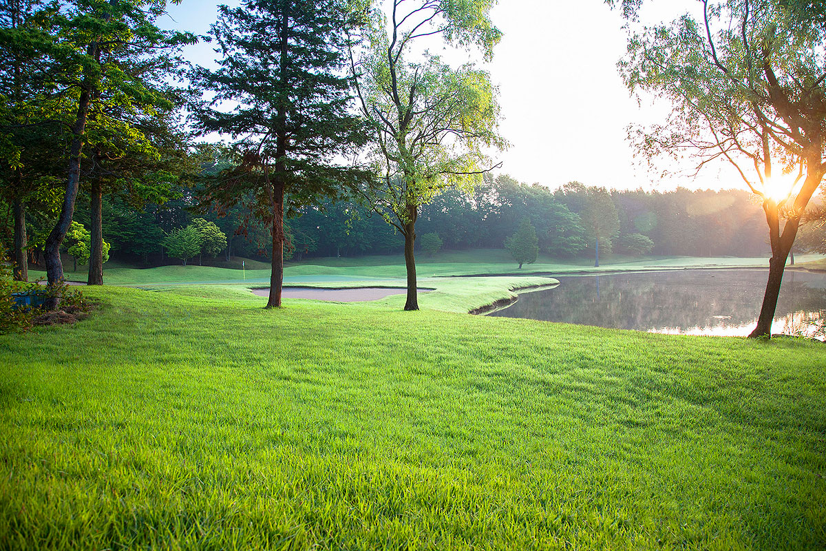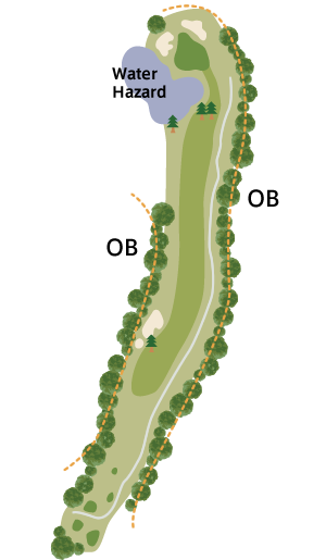 左ドッグレッグのロングホール。狙い目はフェアウェイ右サイド。セカンドは池手前に刻み3打目勝負。